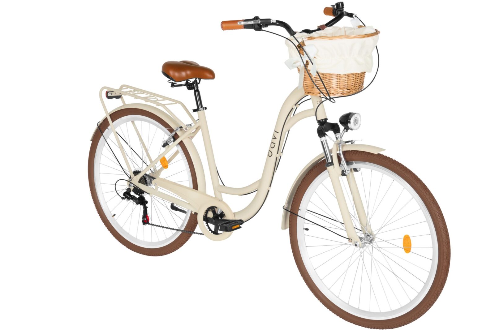 În spate există un portbagaj clasic, pe care puteți instala un scaun pentru copii, genti suplimentare sau transporta articole diverse. Bicicleta va fi livrată cu coș și tot ce se vede în poza.