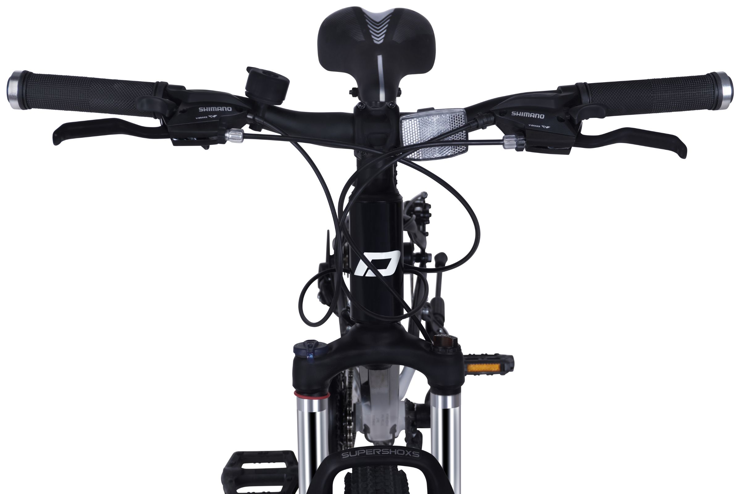 Furca amortizată cu blocare, cursă de 38 mm, reglare preload + lock-out și amortizor negru atenuează eficient vibrațiile și denivelările apărute în timpul deplasării pe teren accidentat. Crește confortul pe denivelări, borduri și trasee neasfaltate. Datorită acestui fapt, bicicleta se dovedește mai eficientă în timpul plimbărilor zilnice și al excursiilor în teren. Funcția de blocare (lock-out) permite rigidizarea furcii pe drumuri drepte, eliminând pierderile de energie la pedalare.
